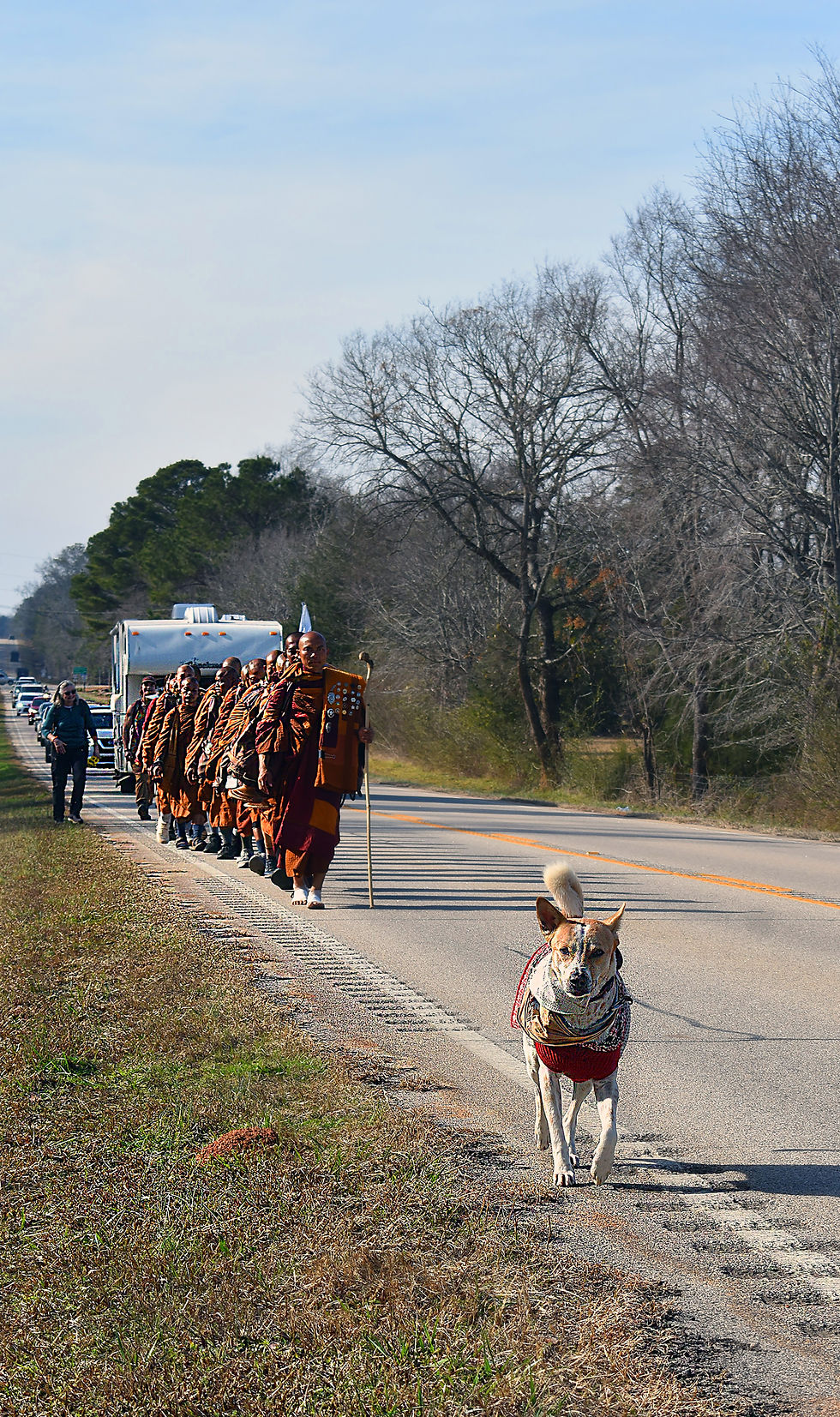 If you have been asleep for a couple of weeks, or on a ski vacation under three feet of snow, or living in your parents basement, you have not heard of the Monks from Texas walking over 1500 miles to Washington, DC. Well they are and they just came over the border from Georgia to South Carolina walking for peace. Horray for these 19 Monks and their street dog Aloka. I went out to get a few images in a rural setting and will also catch them again as they enter Columbia in a few days. Not particularly fine art, but a fun mission. Each one thanked this kneeling photographer as they walked by and I was certainly impressed by their chore and the great attitude of Peace they displayed. Wouldn't hurt any of us to take heed.